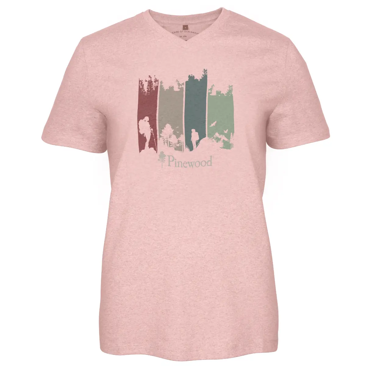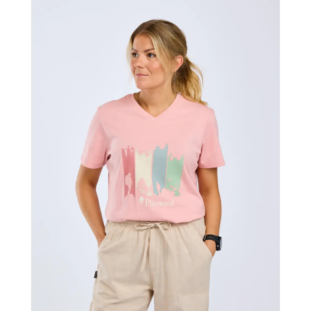 T-shirten har en feminin pasform med V-hals, der giver et moderne og komfortabelt udtryk. Den fungerer perfekt til outdoor-aktiviteter, rejser og afslappet hverdagsbrug.